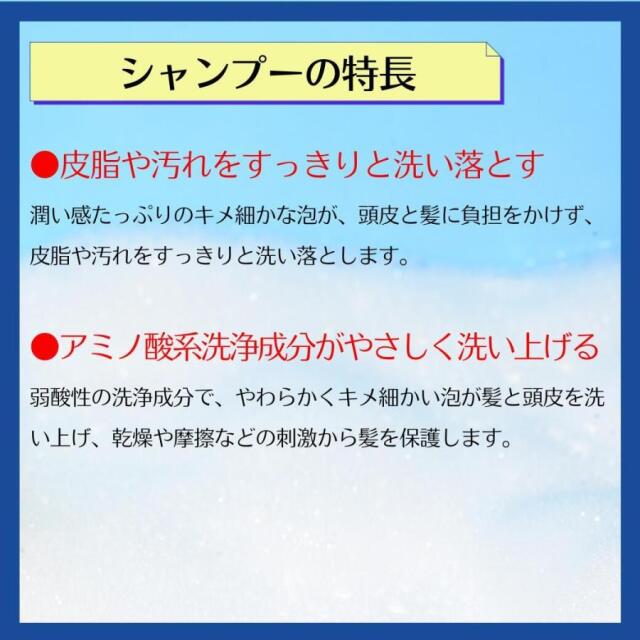 【使用方法】 髪を濡らして適量を髪全体に付け、充分に泡立て頭皮をマッサージするように洗います。