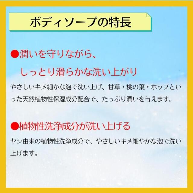やさしいキメ細かな泡で洗い上げ、甘草・桃の葉・ホップといった天然植物性保湿成分配合で、たっぷり潤いを与えます。