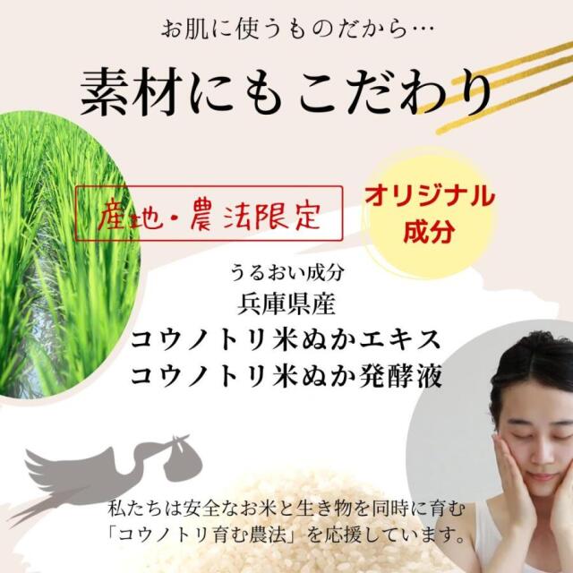 コウノトリ育む農法【特別天然記念物・絶滅危惧種「コウノトリ」も住める、安全なお米と生き物を同時に育む農法】で栽培されたお米を厳選し、開発したオリジナル米ぬか成分です。保湿作用をはじめ、お肌のハリ・しなやかさを保つエイジングケア(※1)効果が期待できます。