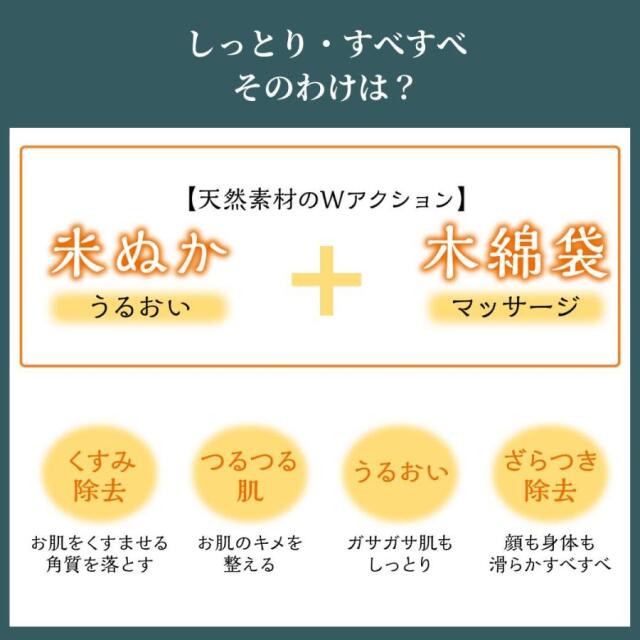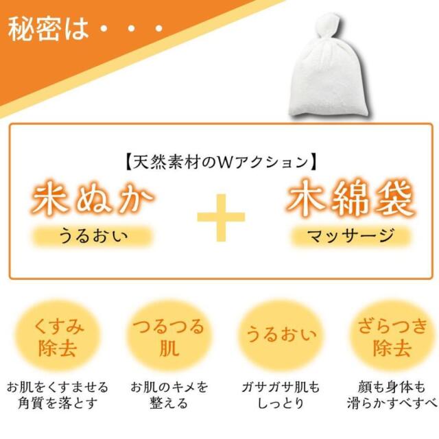 米ぬかエキスのうるおいと木綿袋のマッサージ効果。
