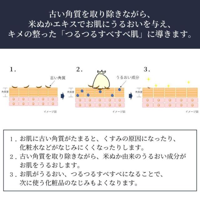 古い角質を取り除きながら、米ぬかエキスでお肌にうるおいを与え、キメの整った「つるつるすべすべ肌」に導くのです。
