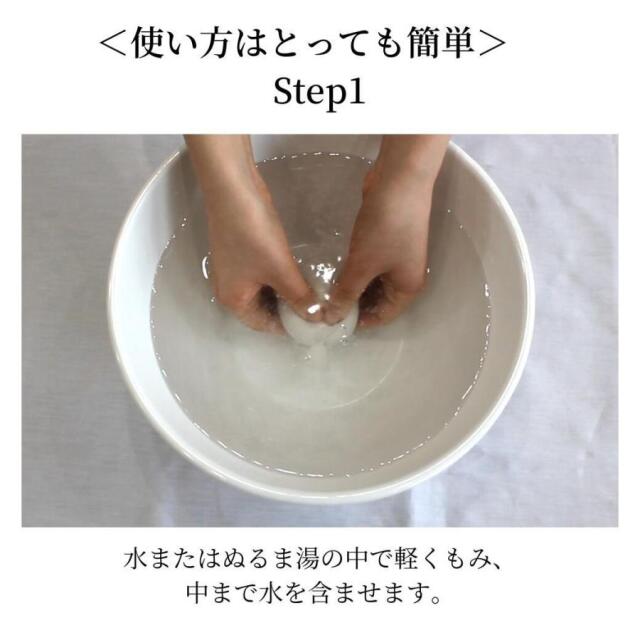 1.水又はぬるま湯の中で軽くもんで、中まで水分をよく含ませてください。